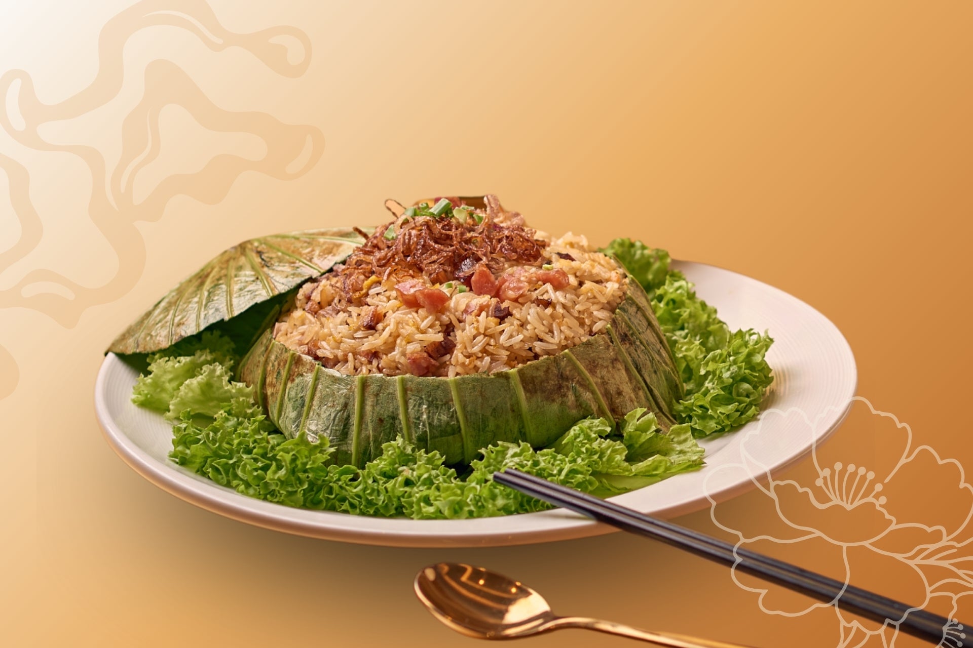• Steamed Lotus Leaf Fragrance Rice with Chinese Sausage and Wax Meat